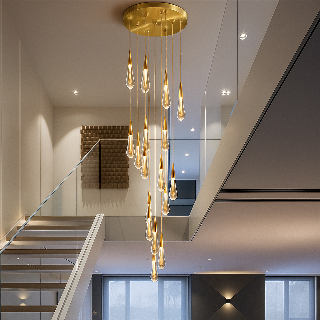 Parfait pour sublimer un salon, une cage d’escalier ou une entrée à haut plafond, ce lustre élégant à 13 suspensions Tea Drop, conçu en verre cristallin soufflé pour un effet lumineux raffiné et moderne. Chaque goutte reflète la lumière avec éclat, créant une ambiance chaleureuse et luxueuse.
