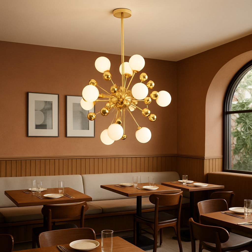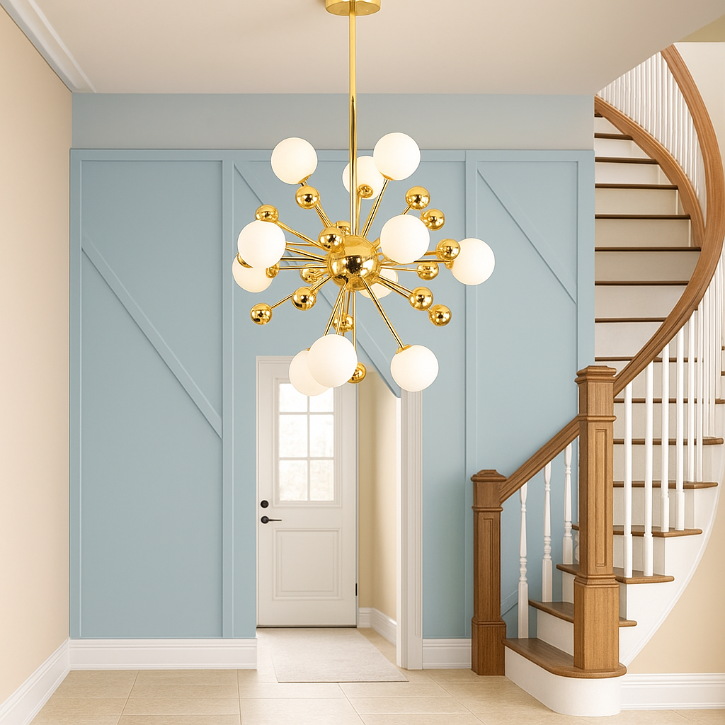 Ce Lustre Eleven 11 branches en doré et boule blanche en verre, diffuse une lumière douce et crée une ambiance chaleureuse et sophistiquée. Facile à installer avec un simple tournevis, vous pouvez le monter vous-même ou faire appel à un technicien spécialisé pour une installation sans souci.